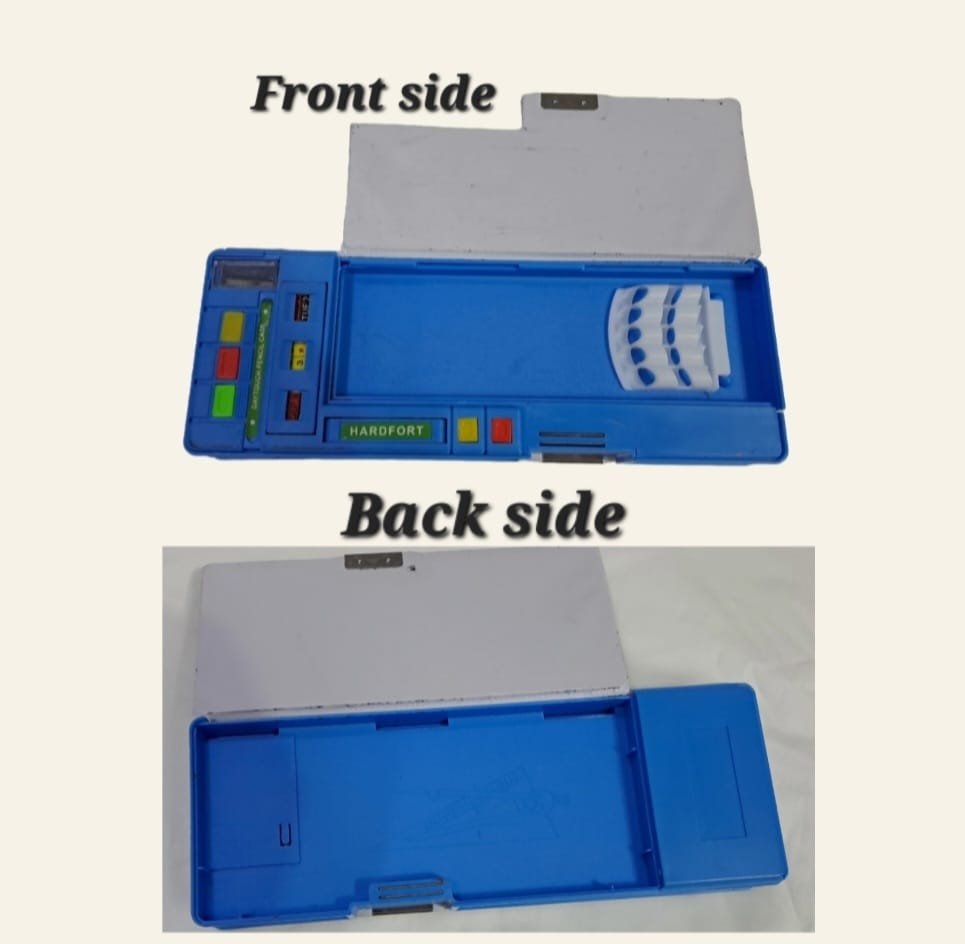 Fancy Magnetix Pencil Box Double Sided 5 buttons Magnetic Lock Fancy Pencil Box for Boys & Girls - Thermameter Calender Sharpener Included Cartoon Printed